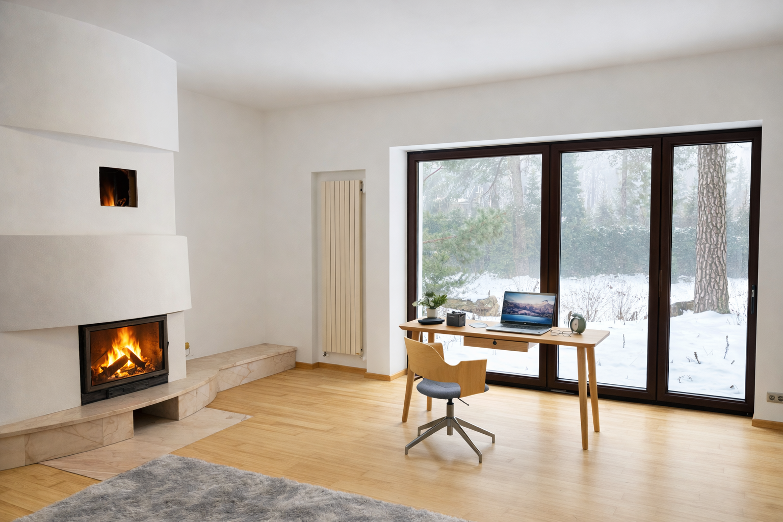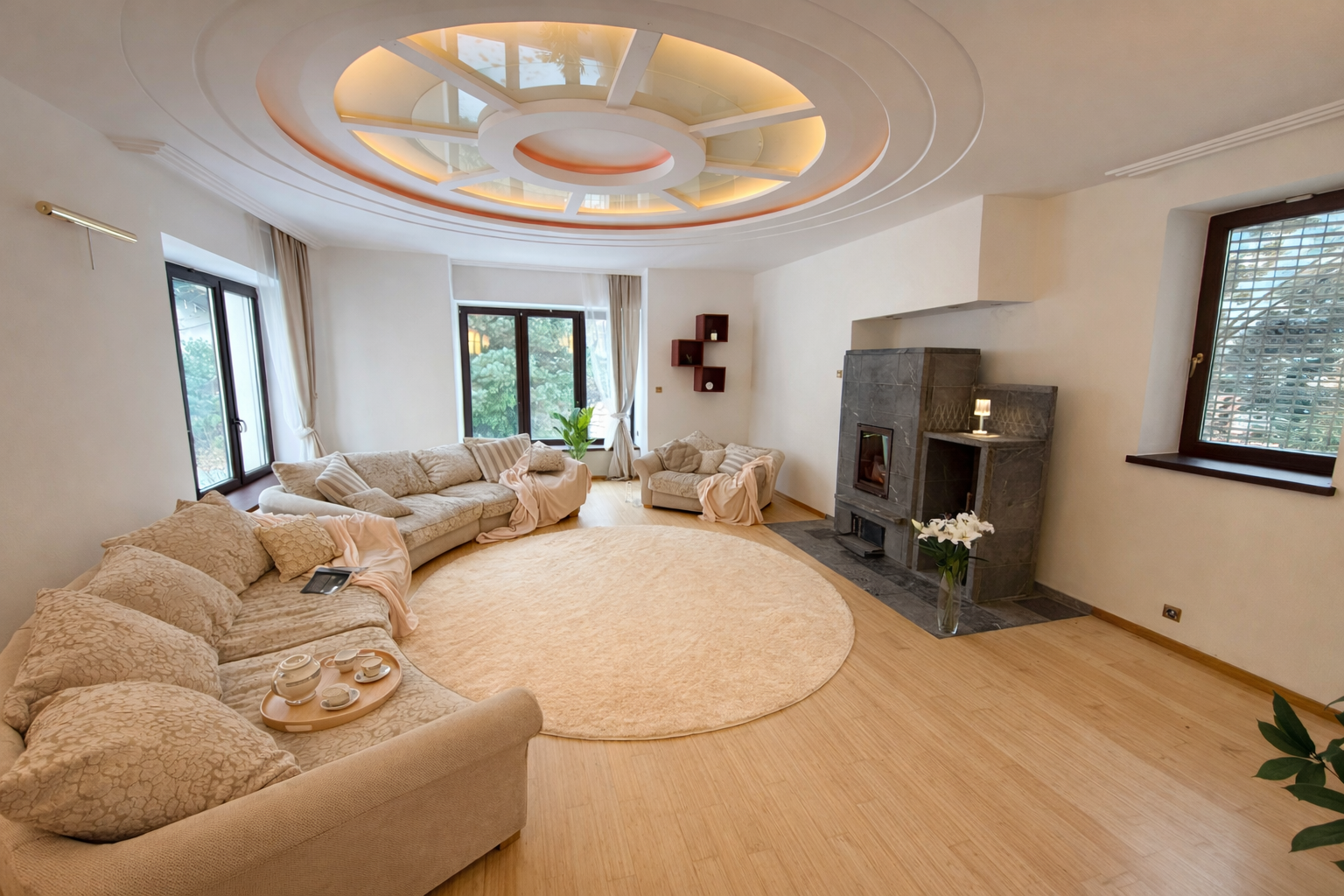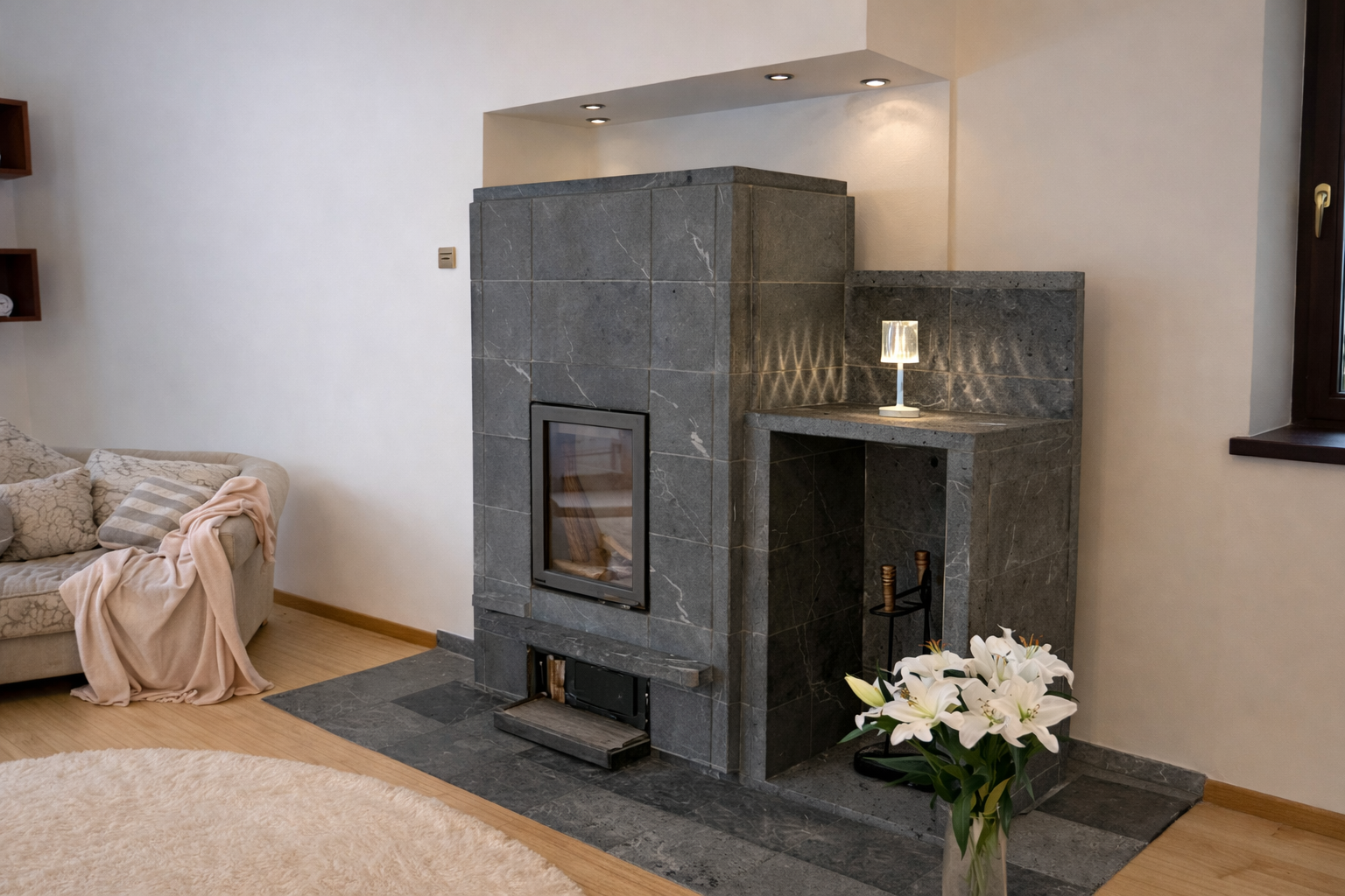 - przestronny salon z kominkiem steatytowym i dużymi przeszkleniami